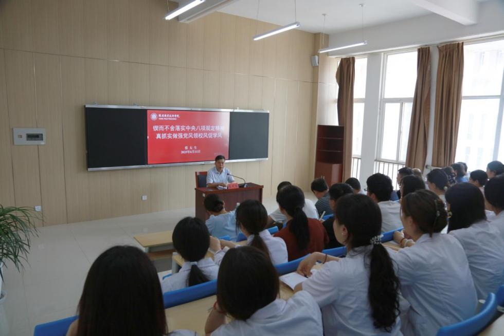 蔡太生结合学校实际就全校学习贯彻习近平总书记考察河南时的重要讲话精神,从严从实推进深入贯彻中央八项规定精神学习教育提出要求:一要持续深入学,推动入心见行。要持续深入学习习近平总书记关于加强党的作风建设的重要论述和中央八项规定及其实施细则精神,切实增强贯彻落实的自觉性主动性;二要持续全面查,找准问题不足。要全面深入查找落实中央八项规定及其实施细则精神方面存在的问题,列出问题清单,查摆具体表现,深挖问题根源。三要持续抓好集中整治,推动解决问题。要建立集中整治台账,明确责任单位、责任人和时间表,抓紧抓实,一抓到底。四要坚持常态长效,抓好建章立制。要着眼长远、建立健全长效机制,进一步强化制度执行,真正让铁规发力、禁令生威。
