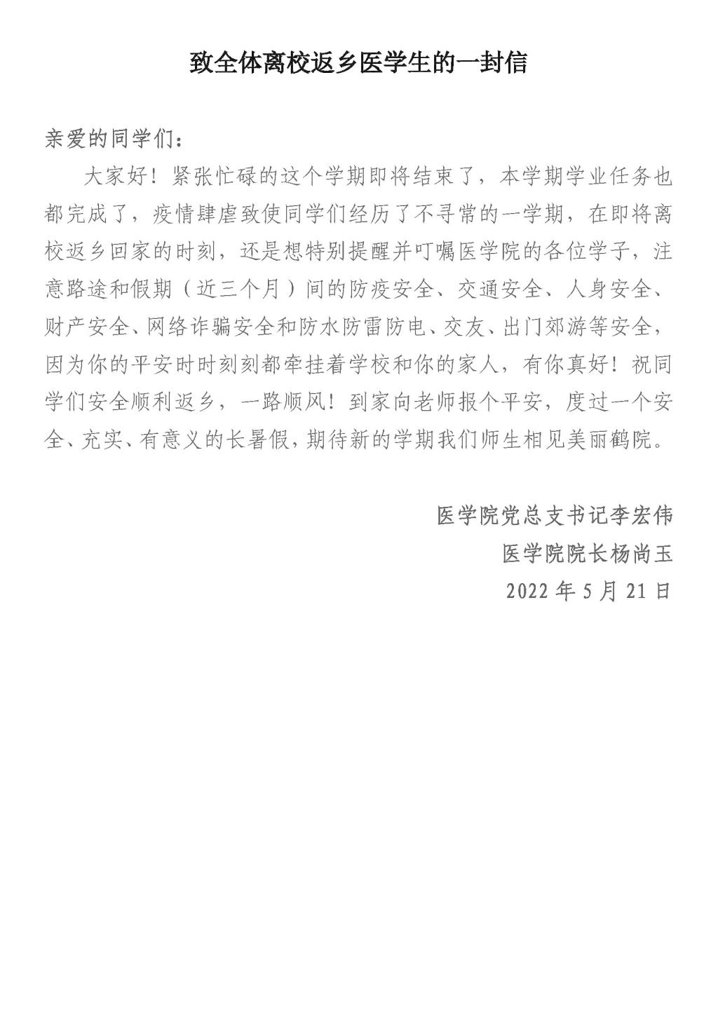 2022年5月21日(星期六),bw必威西汉姆联官网向全体医员工发送了“致全体医员工的一封信”, 叮嘱员工离校返乡要做好疫情防护,暑期出行要注意安全,平安、愉快地度过美好假期。