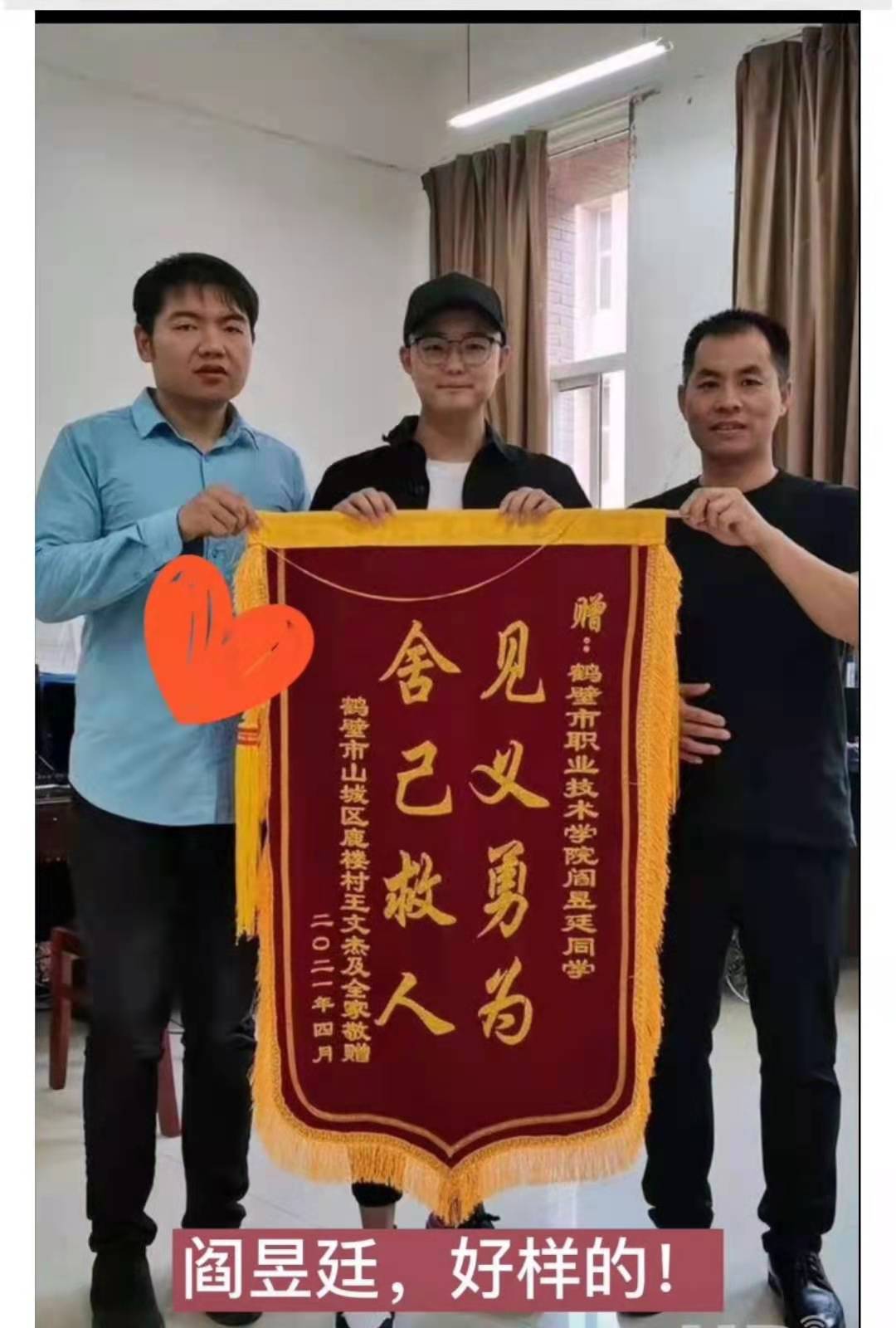 阎昱廷时隔一个多月,在家属多次请求下,他们专程来到阎昱廷就读的学校送来了锦旗和感谢信,感谢他的担当精神,称他是现实版的“活雷锋”。