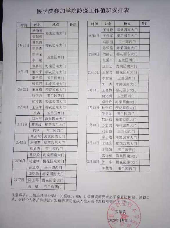 风雪坚守疫情防控岗位 自1月31日起,公司党总支书记李宏伟、经理杨尚玉率先站在防疫值班第一线,60名教职工放弃春节假期与亲人的团聚,主动请缨、踊跃报名,不畏严寒风雪,在学院海棠园、樱花园和玉兰园三个校区门岗,设立疫情防控“检测点”,每天两位身穿防护服,手持体温检测器的老师一丝不苟检测出入人员的体温。即将退休的何光明老师,家中有年近90岁长期瘫痪在床的老母亲,李娟老师家人突发重症住院,李玲玲、郭杰老师脚踝扭伤,但在接到值班任务后,他们依然能够按时站在防疫值班岗位上;王喜梅、杜守京、苏宏波、孔晓朵、闫凌云、司娟等老师在轮岗人员周转出现困难时,义不容辞到岗;学院工会吴艳琴老师主动请缨参加防疫值班。这是一群平凡的群体,他们尽己所能做着力所能及的事情,他们默默奉献彰显着医者的责任和担当。