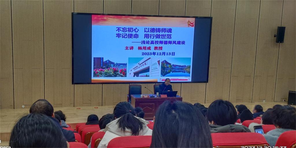 杨用成教授以“不忘初心 以德铸师魂,牢记使命 用行做世范”为主题,以什么是师德师风开篇,旁征博引、深入浅出地阐述了师德师风的内涵、加强高校师德师风建设的意义与作用、加强高校师德师风建设的主要举措及师德师风的建议四个方面进行了深度讲授。结合近年来高校师德师风失范典型案例,解读了《新时代高校教师职业行为十项准则》、《教育部关于建立健全高校师德建设长效机制的意见》、《高等学校教师职业道德规范》等文件,从自身从教经历、教学经验,阐述了师德师风是教师的灵魂、教书育人是师德师风的根本特征,教书者必先学为人师,育人者必先行为世范,师德师风的具体体现在敬业、爱业、乐业、精业、勤业和奉献。讲座站位高远、思想深邃、内涵丰富、内容深刻,语言生动、形象,案例新颖、典型,切合高校师德师风实际。