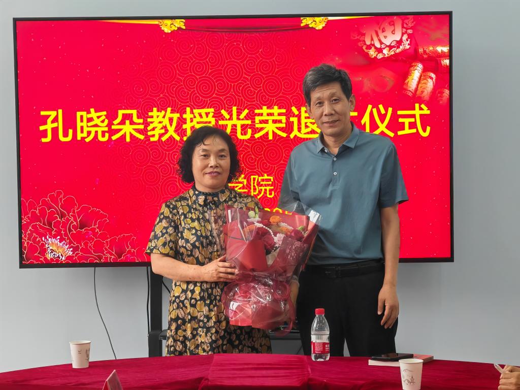雷东辉向孔晓朵教授颁发退休证,祝贺孔教授圆满退休,赞扬孔教授选择教育事业“择一事,终一生”的崇高职业精神,以“莫道桑榆晚,为霞尚满天”寄语孔老师,祝福孔老师开启退休生活新的旅程。
