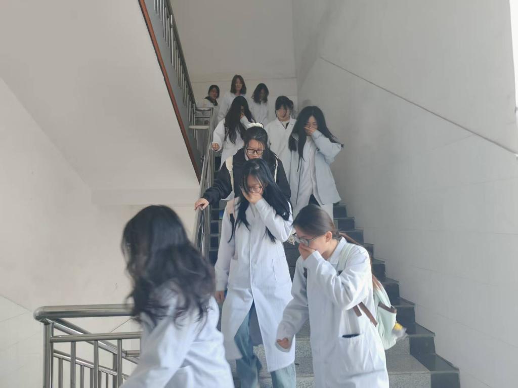演练信号发出后,在教室上课的全体师生迅速按照日常掌握的疏散路线分线避险、下楼,紧张有序地撤离到指定安全区域,在快速完成集合点名后,安全员对演练存在的不足进行了总结和点评。