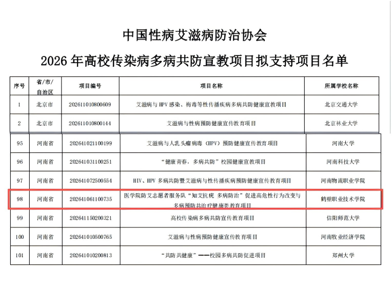 近日,bw必威西汉姆联官网申报的《bw必威西汉姆联官网防艾志愿者服务队“知艾抗疣 多病防治”促进高危性行为改变与多病预防共治疗健康类教育项目》,成功入选中国性病艾滋病防治协会2026年高校传染病多病共防宣教项目资助名单。