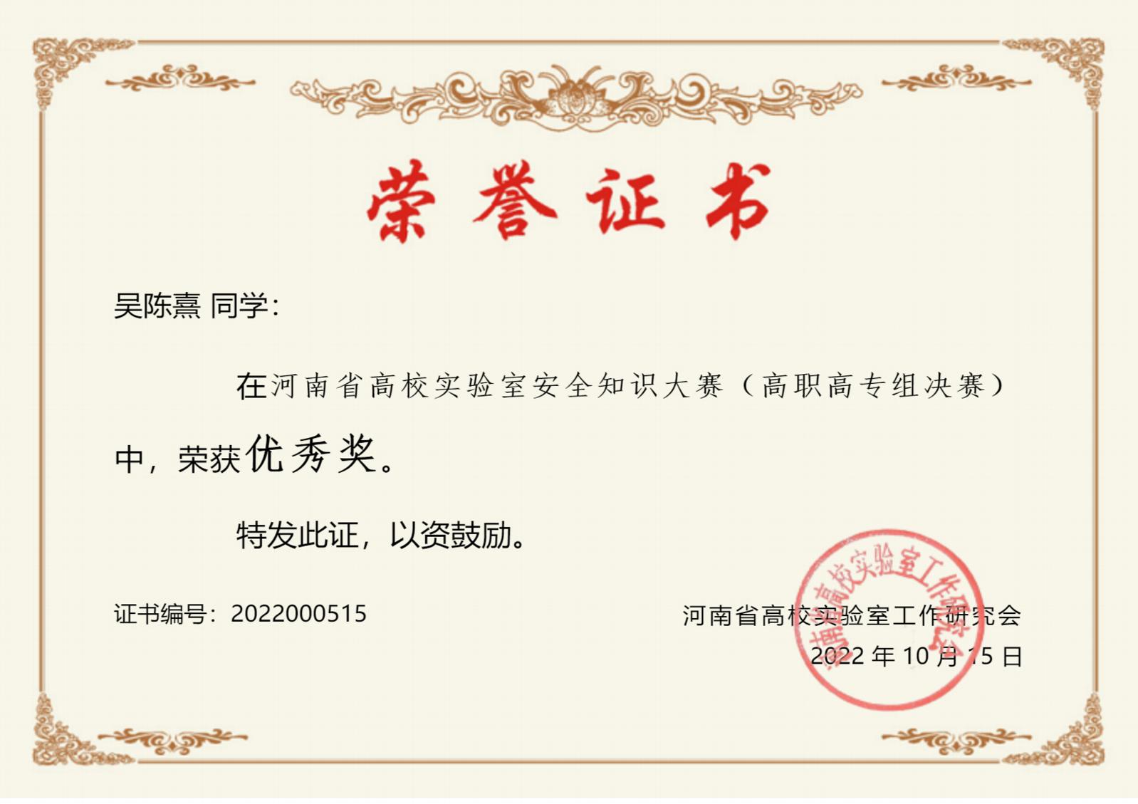 在刚刚结束的河南省高校第二届实验室安全文化宣传月闭幕式暨颁奖仪式上,公司bw必威西汉姆联官网员工吴陈熹同学获得河南省高校实验室安全知识大赛(高职高专组决赛)个人优秀奖,公司仅两名同学获奖。