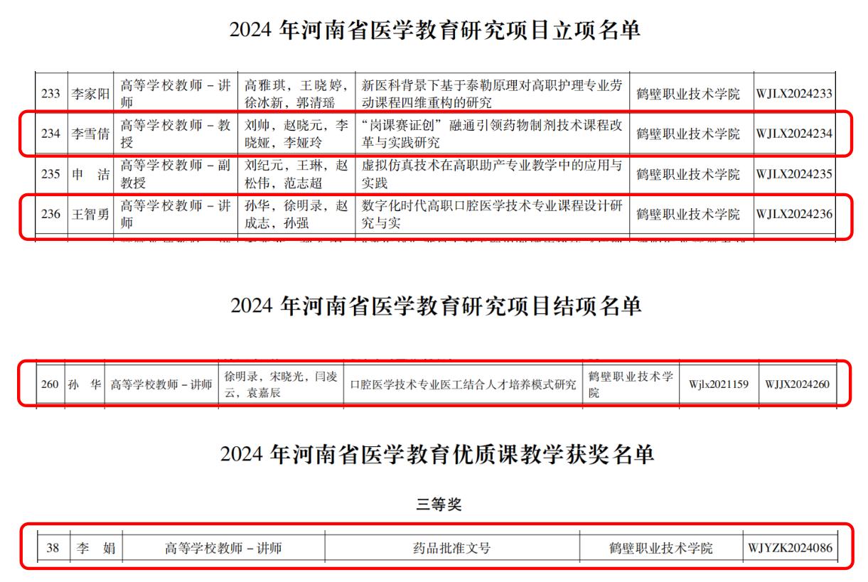 近日,河南省卫生健康委员会印发了《关于公布2024年河南省医学教育研究项目立项教学成果和优质课评选结果的通知》(豫卫科教函〔2024〕26号),公司教师获批河南省医学教育研究项目立项2项、结项1项,荣获河南省医学教育优质课教学三等奖1项。