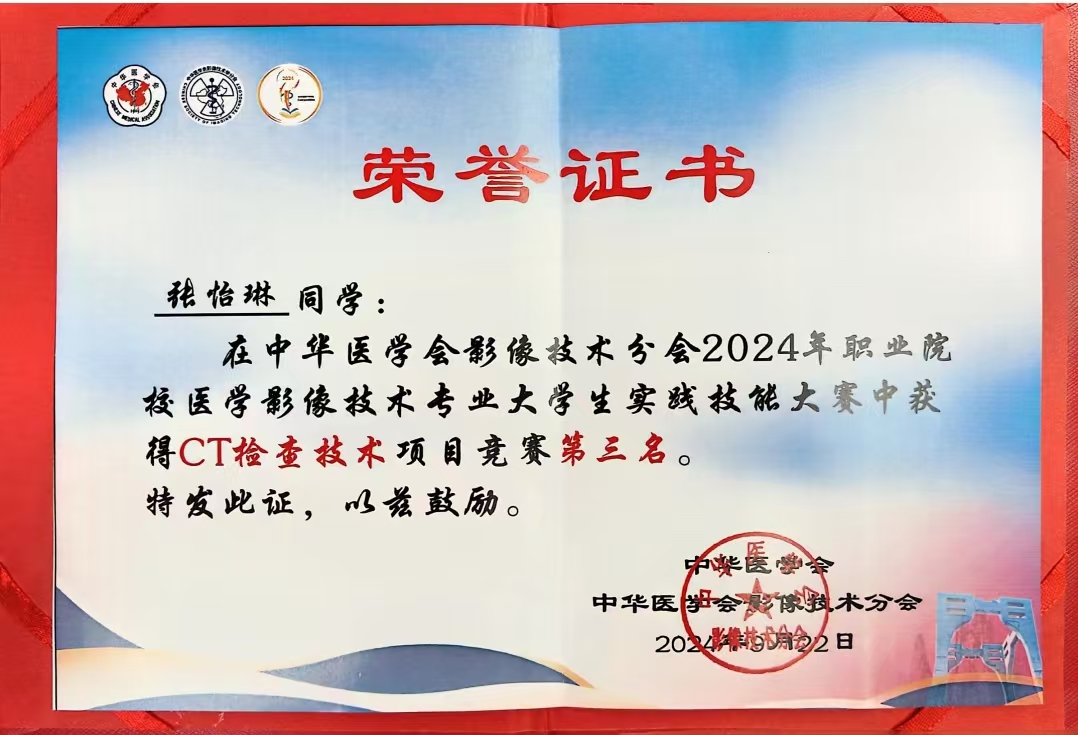 2024年9月20~22日,由中华医学会影像技术分会主办的第十一届“泰山杯”全国职业院校医学影像技术专业员工实践技能大赛在江西省上饶市圆满落幕,公司员工张怡琳在“CT检查技术”项目竞赛中荣获第三名,充分展现了公司员工的专业技能和综合素质。