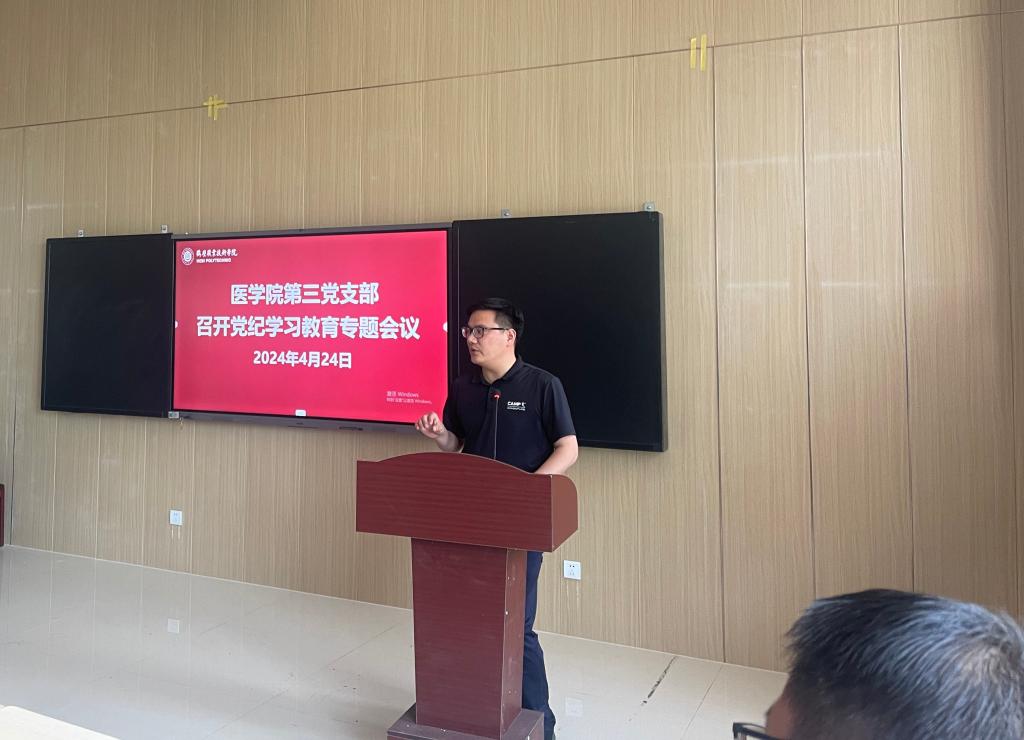 4月24日下午,bw必威西汉姆联官网第三党支部在诚信3号楼D314会议室召开党纪学习教育专题会,会议由支部书记王保军主持,支部全体党员和部分入党积极分子参会。