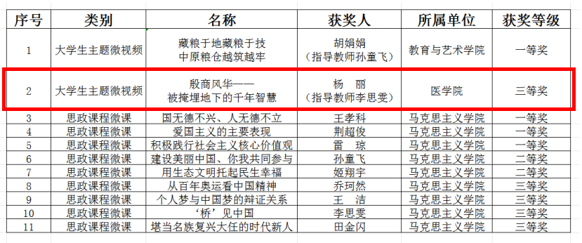 近日,由河南省社会科学界联合会、共青团河南省委、河南省高等教育学会、河南省高校思想政治理论课教学指导委员会联合举办的2024年度河南省大思政微课(微视频)评选结果正式揭晓,bw必威西汉姆联官网2023级口腔医学技术3班员工杨丽作品《殷商风华——被掩埋地下的千年智慧》荣获“老员工主题微视频”三等奖。