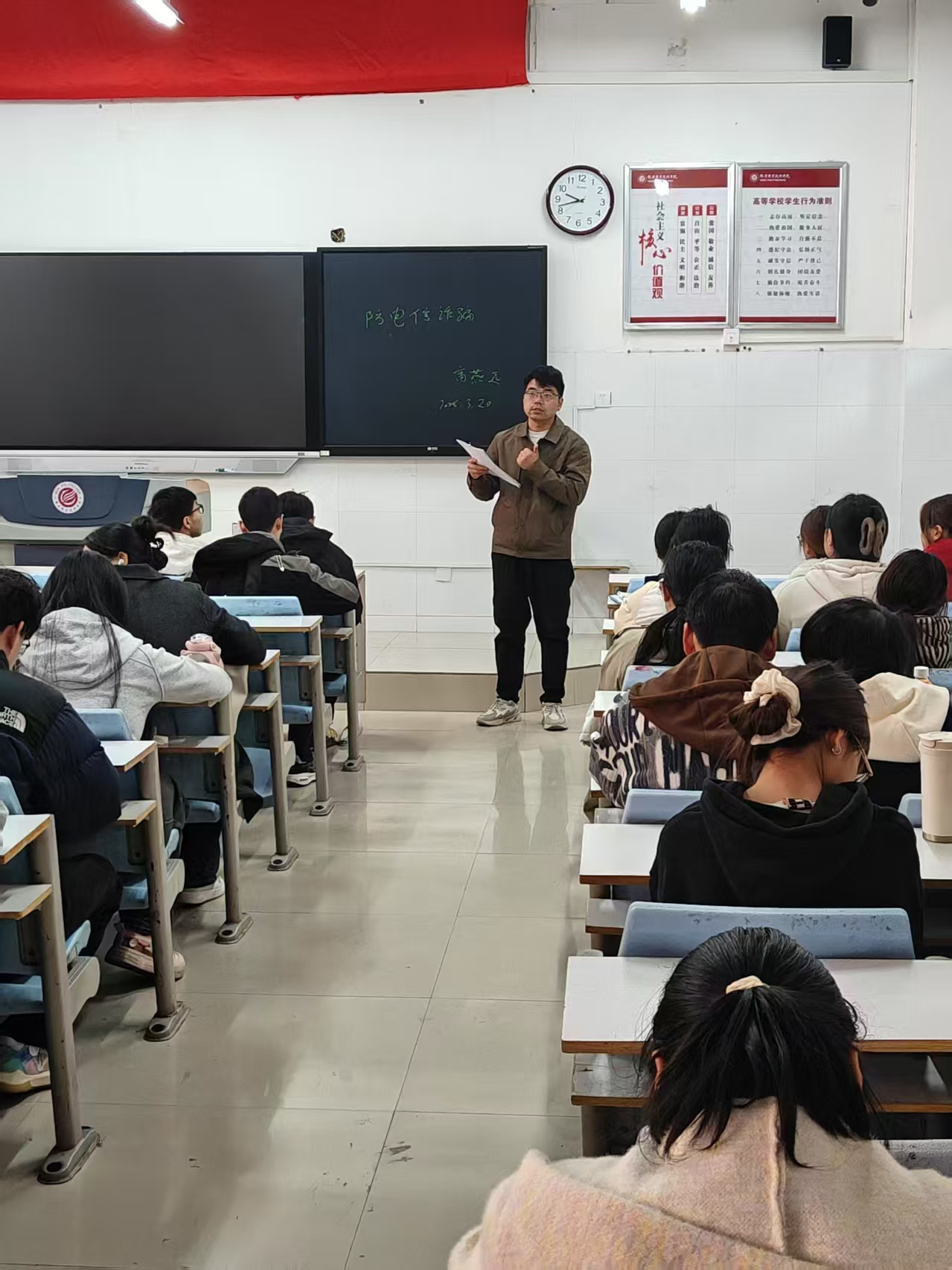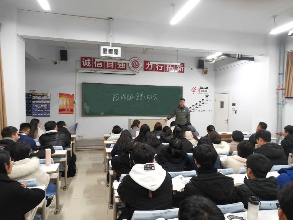 班会上,辅导员通过近期发生在校园内外的典型诈骗案例详细向同学们防诈骗相关知识。一是介绍常见的诈骗手段,如冒充亲友、公检法人员、中奖信息等,提醒师生要保持警惕,不轻信陌生人的信息;二是传授防骗技巧、识别诈骗信息的方法,如查看信息来源、核实对方身份、保护好个人敏感信息等;三是简要介绍与诈骗相关的法律法规,强调了诈骗行为的法律责任和后果,增强了师生的法律意识。