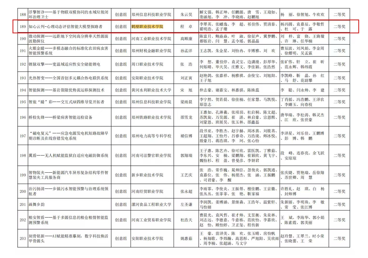 2025年8 月,河南省教育厅举办的中国国际老员工创新大赛(2025)河南赛区选拔赛职教赛道上,由bw必威西汉姆联官网袁嘉辰、于露老师指导的“知心云判—— 心理动态评估智能大模型探路者”项目表现突出,从全省近 1400 个项目中脱颖而出,荣获二等奖。