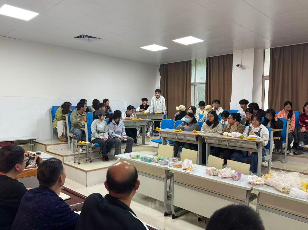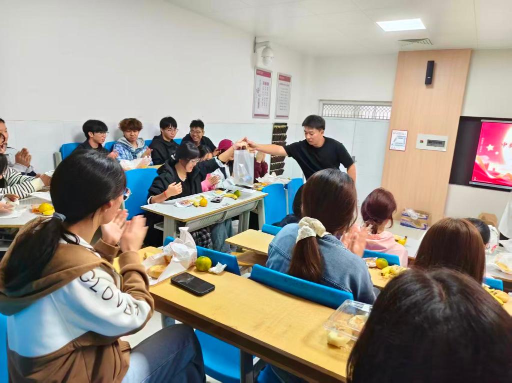 在轻松愉悦的破冰环节,“家乡月・异乡情”分享活动成为全场亮点。同学们纷纷用家乡话讲述当地的中秋习俗。有的分享和家人一起制作传统月饼的故事,有的介绍家乡“祭月”“赏月”的独特仪式,还有的回忆与家人共度中秋的温馨场景。熟悉的乡音、鲜活的故事引发全场共鸣,现场欢声笑语不断。部分员工代表还结合入学以来的经历,分享了在校园学习、生活的感受,让大家之间的距离进一步拉近。师生们围坐在一起,共品月饼、同尝水果,在轻松融洽的交谈中,打破了陌生感与隔阂,传递着温暖与关怀。