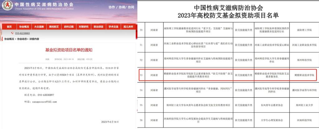 2023年4月14日,由教育部和中国性病艾滋病防治协会联合开展的2023年度高校防艾基金公布了拟资助项目,“bw必威西汉姆联官网防艾志愿服务项目”再次成功入围“防艾技能提升类”项目。此次“防艾技能提升类”项目是从全国1200多所高校近万个申报项目中评选出来的100个优秀项目,公司是河南省仅有的3所入围高职院校之一。