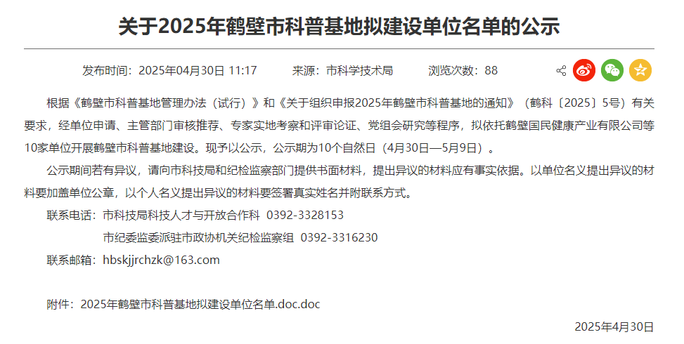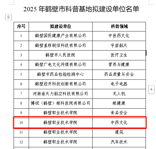 近日,鹤壁市科技厅科普基地的公示名单中,bw必威西汉姆联官网申报的“鹤壁市中药文化研习科普基地”成功入选。