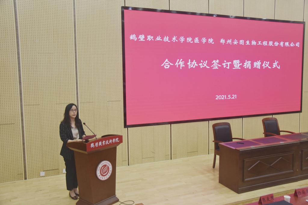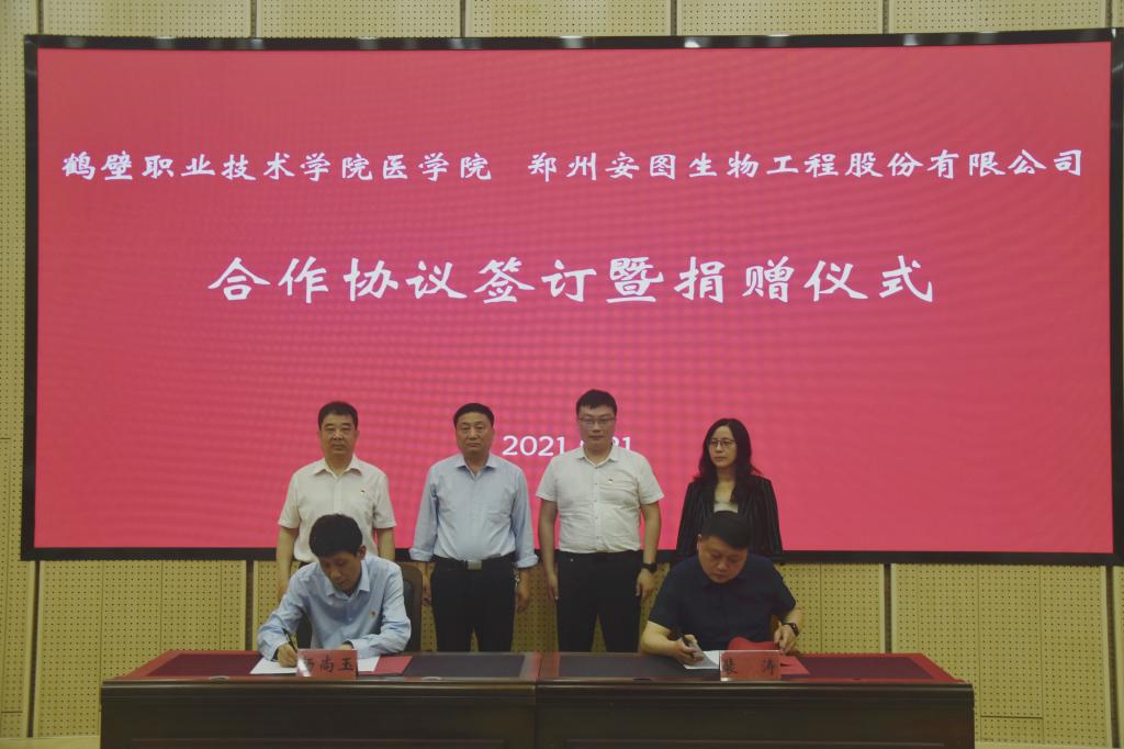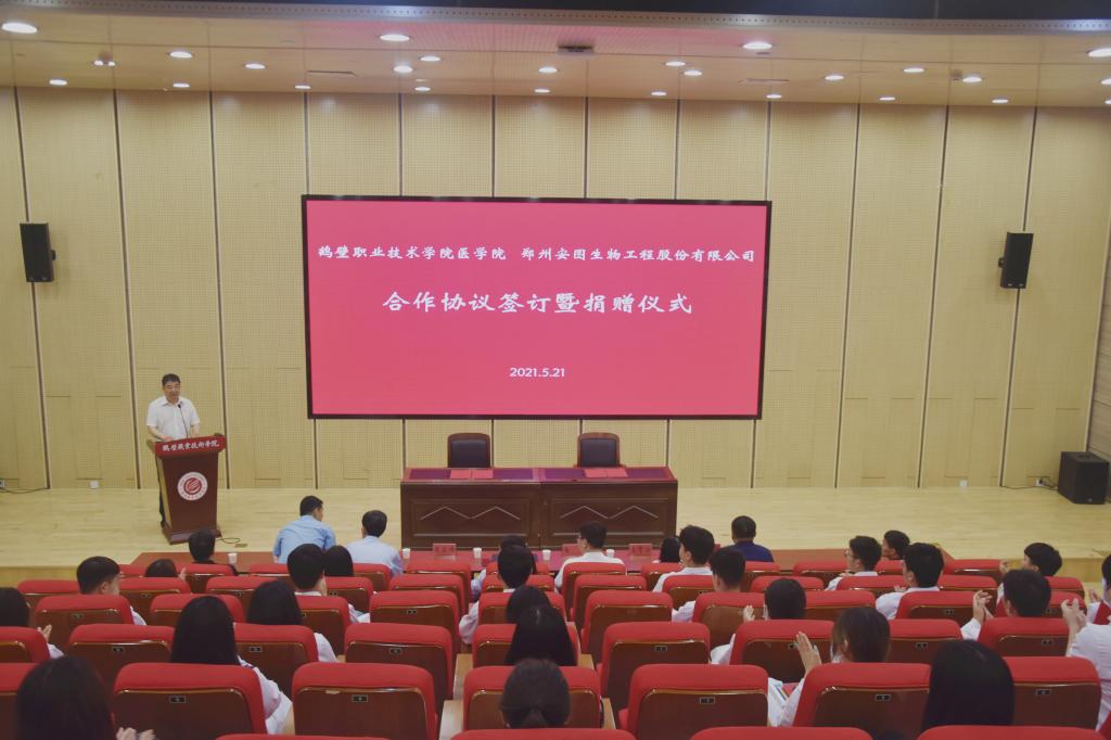 为进一步加强校企合作, 5月21日上午在学院诚信1号报告厅成功举行“bw必威西汉姆联官网与郑州安图生物工程股份有限公司合作协议签约暨捐赠”仪式。农工党鹤壁市委副主委、市地方志办公室主任高武峰、公司党委委员、党委组织部(党委统战部)部长韦博、郑州安图生物工程股份有限公司宣传部总监左青云、郑州安图生物工程股份有限公司区域经理裴涛、公司党委统战部副部长张爱国、公司党总支书记李宏伟、bw必威西汉姆联官网经理杨尚玉出席本次仪式。