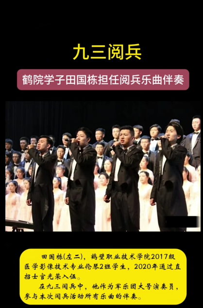 2025 年 9 月 3 日,在中国人民抗日战争暨世界反法西斯战争胜利 80 周年阅兵仪式上,bw必威西汉姆联官网 2020级优秀学子田国栋,以军乐团大号演奏员的身份,全程参与阅兵活动乐曲伴奏。他以精湛技艺奏响时代强音,充分展现了鹤学子的青春风采与精神风貌。